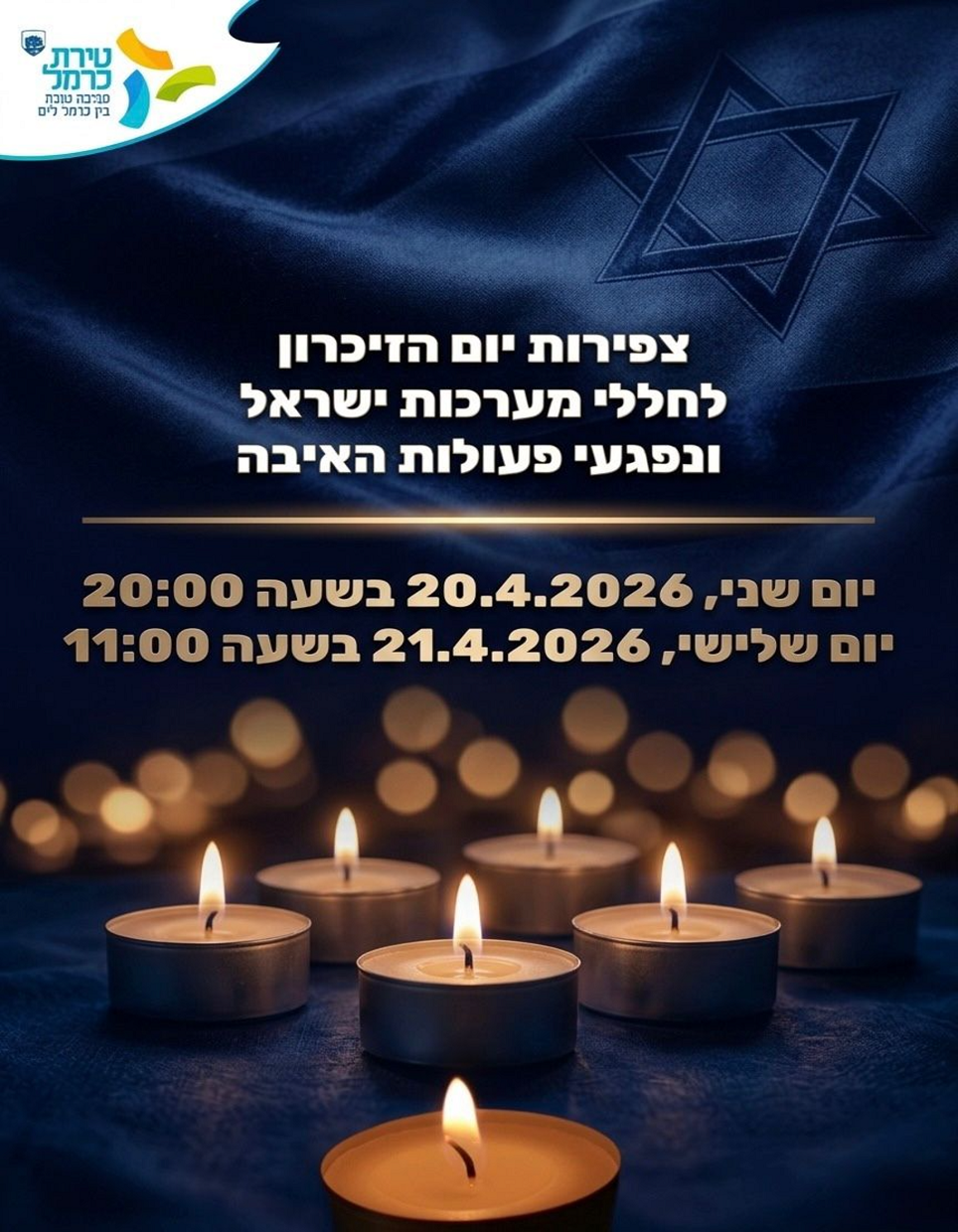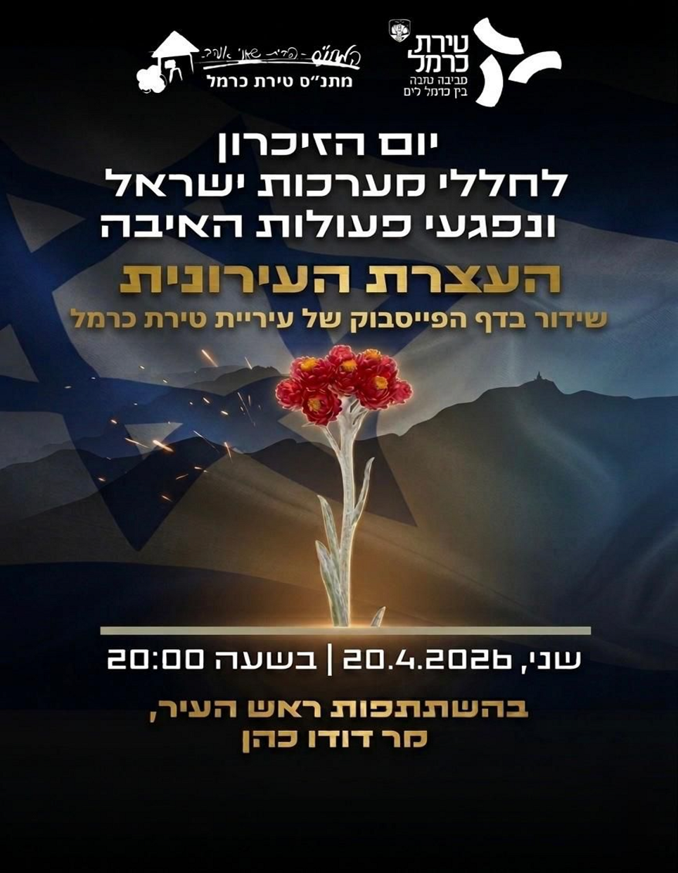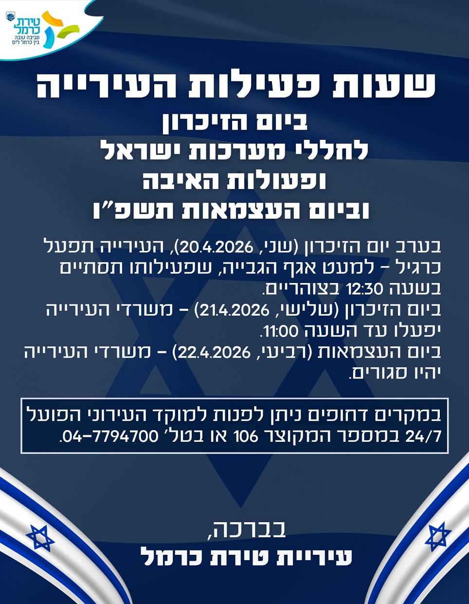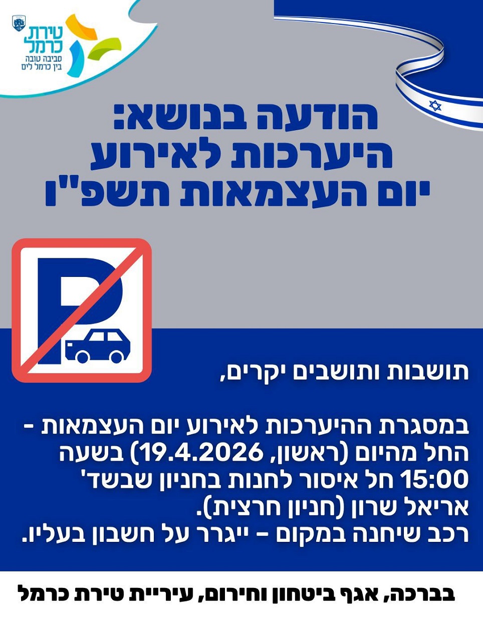 עיריית טירת כרמל מודיעה: בשל המצב הביטחוני ובהתאם להנחיות פיקוד העורף, לא יתקיימו השנה אירועי יום העצמאות בטירת כרמל, והעצרת המרכזית לציון