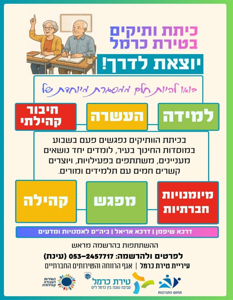 עיריית טירת כרמל, באמצעות אגף הרווחה והשירותים החברתיים, משיקה את תוכנית "כיתות ותיקים", שתפעל בבתי הספר העל-יסודיים בעיר – דרכא אריאל, דרכא שיפמן וביה"ס לאמנויות ומדעים. מדובר בתוכנית שהחלה את דרכה בתיכונים שונים בארץ מתוך רצון של אזרחים ותיקים לנצל את המעבר מעולם העבודה לתקופת הגמלאות, להמשך התפתחות וצמיחה באמצעות למידה והתנסות.