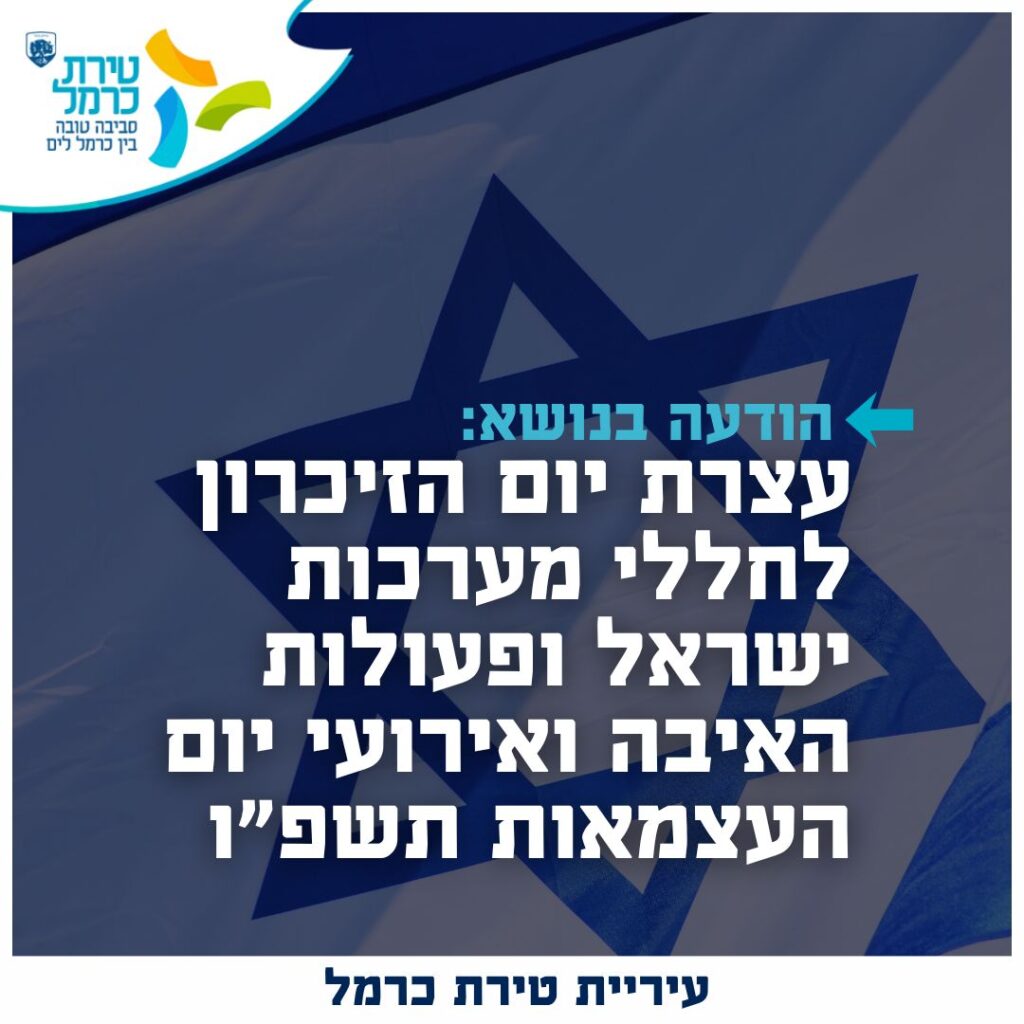 עיריית טירת כרמל מודיעה: בשל המצב הביטחוני ובהתאם להנחיות פיקוד העורף, לא יתקיימו השנה אירועי יום העצמאות בטירת כרמל, והעצרת המרכזית לציון יום הזיכרון לחללי מערכות ישראל ונפגעי פעולות האיבה ייערך במתכונת שונה. הטקס, שצולם השבוע מראש, ישודר בנכסים הדיגיטליים של העירייה