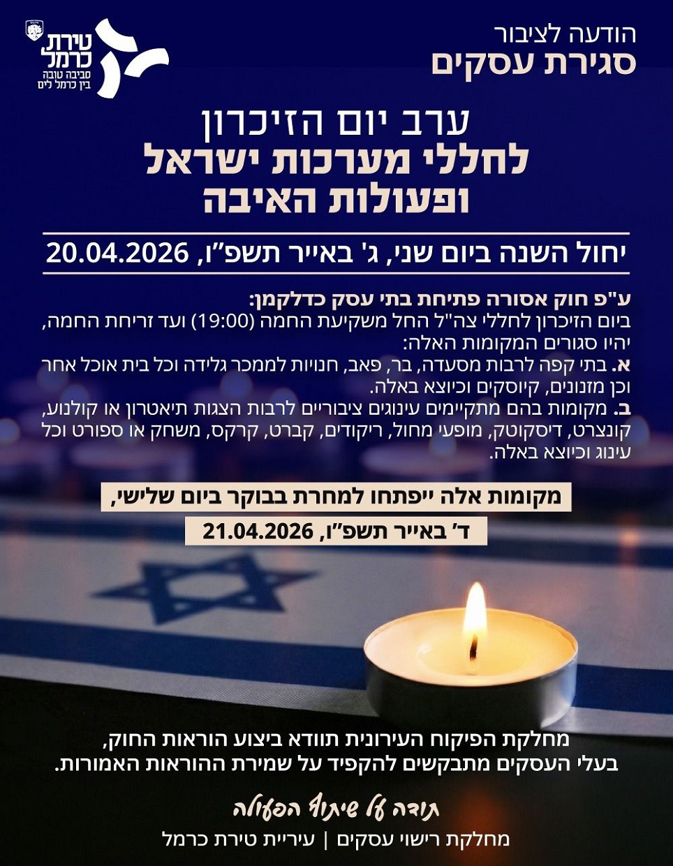 ראש העיר טירת כרמל, דודו כהן: "מדובר בהחלטה לא פשוטה, אך מחויבת המציאות נוכח המצב הביטחוני. לצד האחריות העליונה לשלום התושבות והתושבים, חשוב לנו לשמור על הזיכרון, הכבוד וההוקרה לחללי מערכות ישראל ולנפגעי פעולות האיבה, גם בימים מורכבים אלה. אנו מזמינים את הציבור להצטרף לטקס באמצעות הפלטפורמות הדיגיטליות ולהתייחד יחד עם זכר הנופלים.