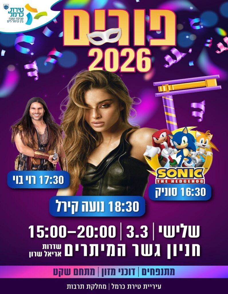 עיריית טירת כרמל נערכת לקראת האירוע המרכזי של חג הפורים בעיר שיתקיים ביום שלישי הבא 3/3/26 במתחם הבמה שבחניון גשר המיתרים בשד' אריאל שרון 9, אליו צפויים להגיע קהל של עשרות אלפי בני אדם מטירת כרמל ומערי ויישובי הסביבה. על הבמה יופיעו: סוניק (בשעה 16.30), רוי בוי (17.30) ונועה קירל (18.30) שמגיעה לטירת כרמל אחרי שכבשה את אירופה באירוויזיון עם השיר "יוניקורן". בנוסף יהנו המשתתפים מדוכני מזון ומתנפחים לילדים. הכניסה חופשת ומומלץ להגיע מחופשים. האירוע מופק ומאורגן על-ידי עיריית טירת כרמל ומתנ"ס טירת כרמל. בשל קיום האירוע יחולו שינויים בהסדרי התנועה והחנייה ברחוב אריאל שרון וברחובות הסמוכים למתחם האירוע. הציבור מתבקש לגלות הבנה ולהישמע להנחיות.