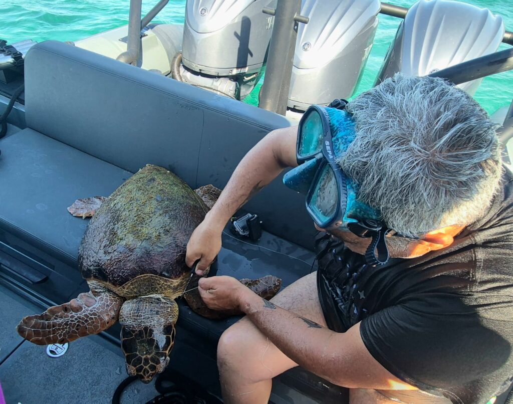 פקחי היחידה הימית של רשות הטבע והגנים חילצו צב ים שהסתבך בחוט דיג והצילו את חייו
